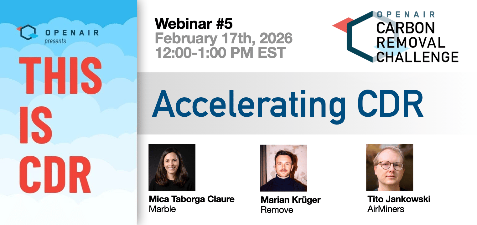 Welcome to the fifth webinar in the OpenAir Collective's 2026 Carbon Removal Challenge monthly webinar series! We're proud to present a panel on CDR accelerators, with AirMiners' Tito Jankowski, Marble's Mica Taborga Claure, and remove's Marian Krüger.