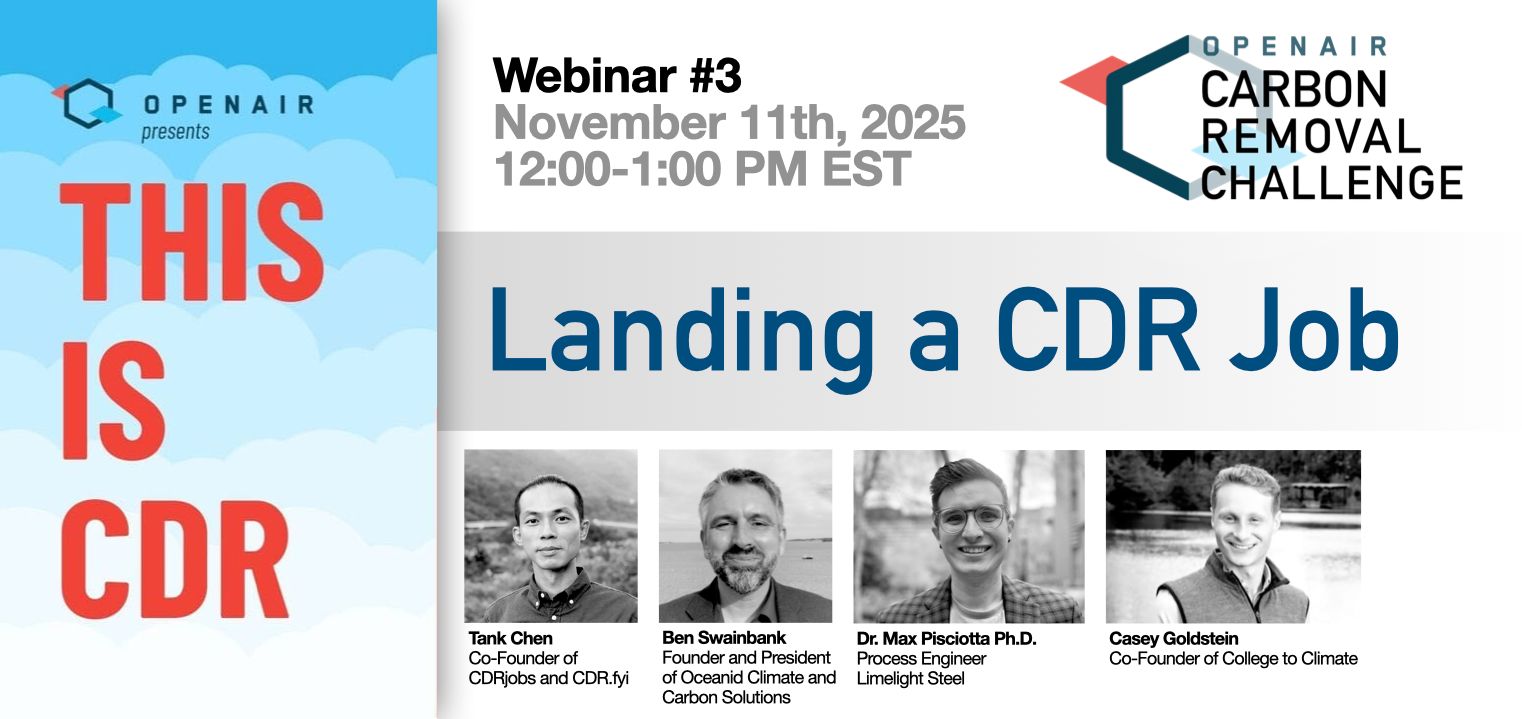 Please joint us for the third webinar in the OpenAir Collective's 2026 Carbon Removal Challenge monthly webinar series! We're proud to present a panel focused on the CDR job market and advice for getting a job in CDR. As our primary audience is the students participating in the Carbon Removal Challenge, we will emphasize entry-level jobs. There will be plenty of time for audience Q&A.